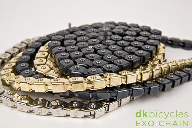 DK Bicycles au lansat si un nou lant in serie limitata : DK EXO disponibil in culorile auriu, crom si negru. COnstructia acestuia este diferita de un lant clasic, zalele fiind mult mai mici din punct de vedere al dimensiunilor iar partea superioara este inchisa.