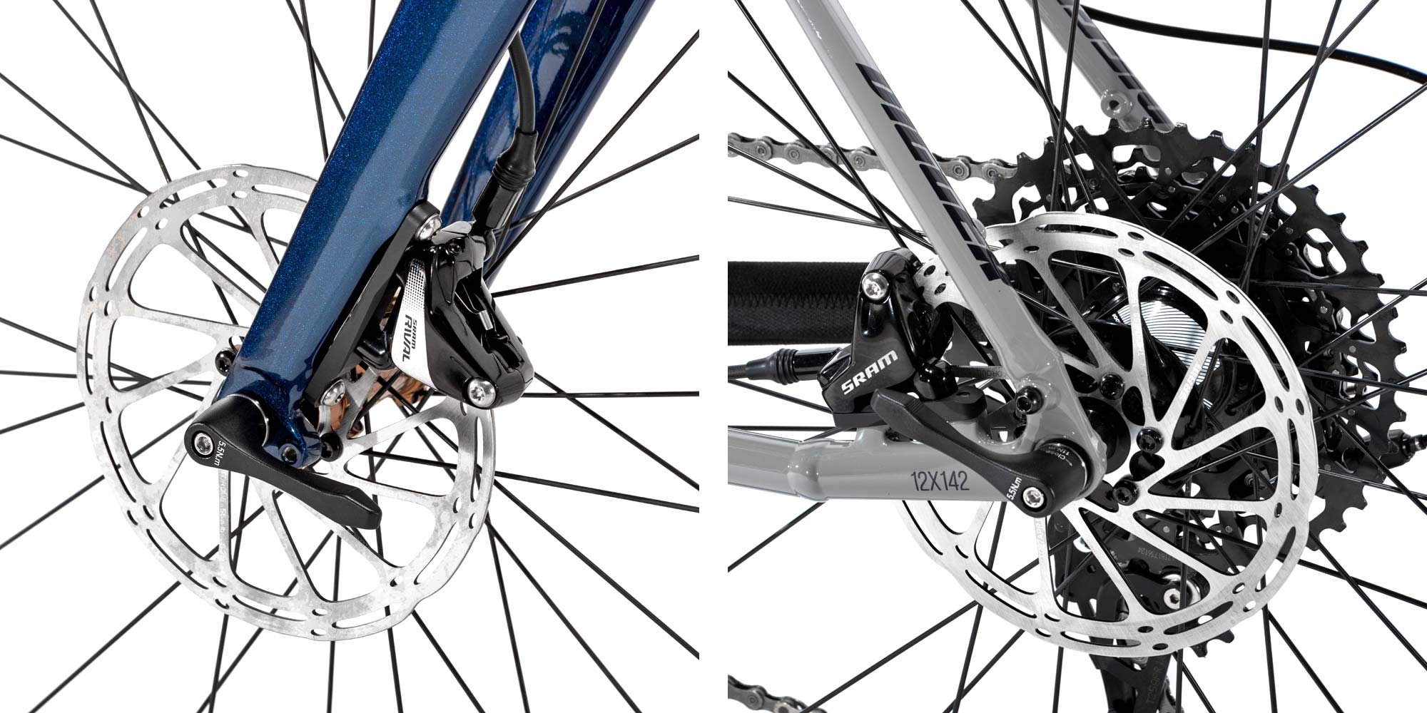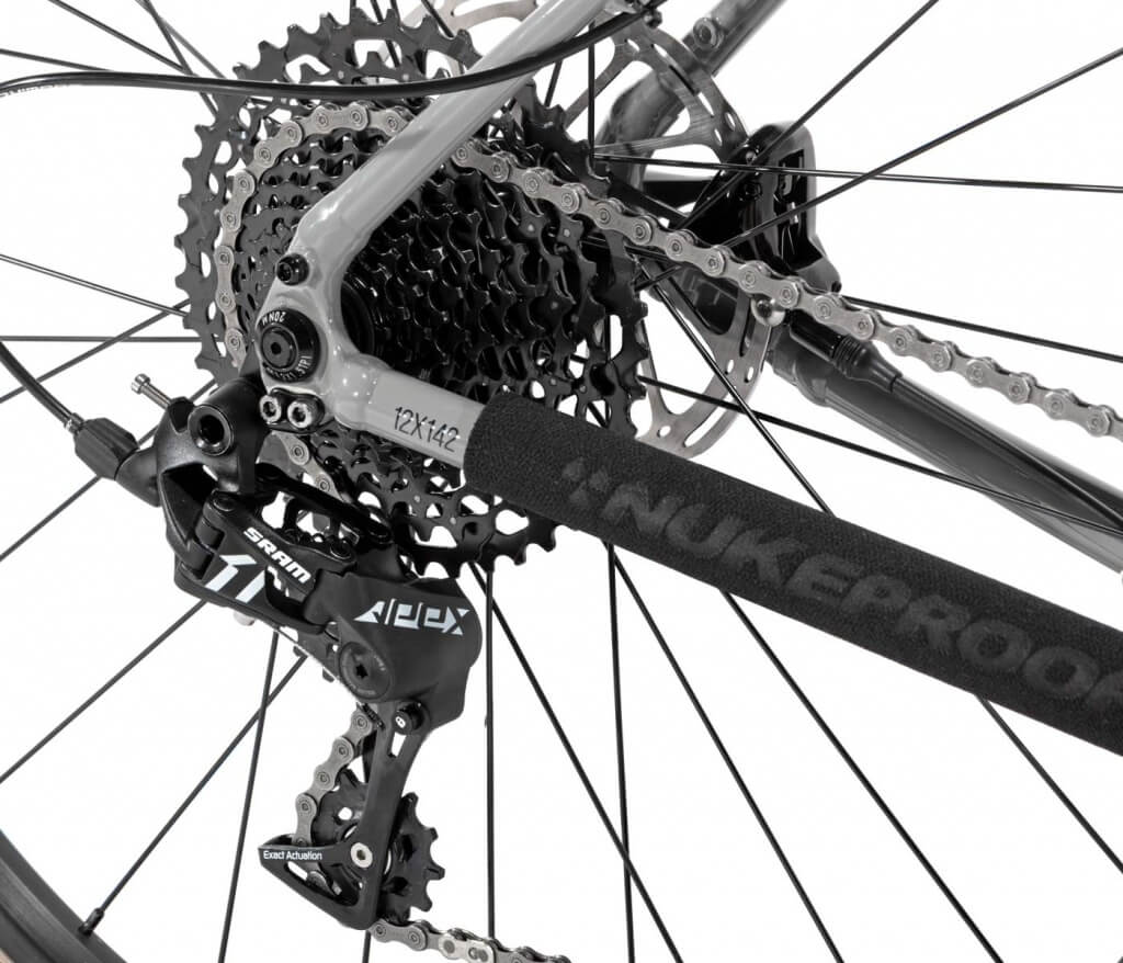 Bicicleta folosește transmisii standard SRAM 1×11 de MTB, ax thru de 12×142 mm și 15×100 mm bolt-on, perfect pentru roțile vechi non-Boost pe care le mai au unii pe acasă.