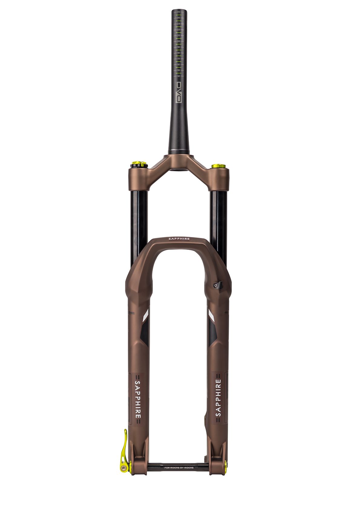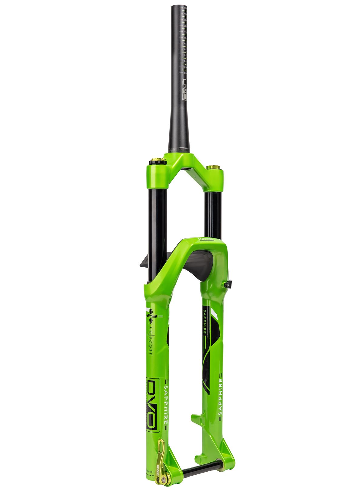 DVO, brand-ul al cărui produse poartă nume de nestemate, a pregătit o nouă furcă, botezată Sapphire. Aceasta va fi disponibilă pentru bicicletele cu roți de 29 de inch, însă va fi la fel de compatibilă cu roțile 27plus, așadar doi iepuri împușcați dintr-un singur foc. Va concura în segmentul All Mountain și va oferi o cursă de 140mm, însă aceasta poate fi redusă intern până la 100mm. Utilizează un ax boost, mai lat, de 110mm, iar partea inferioară are integrată o prindere pentru o aripă de noroi.