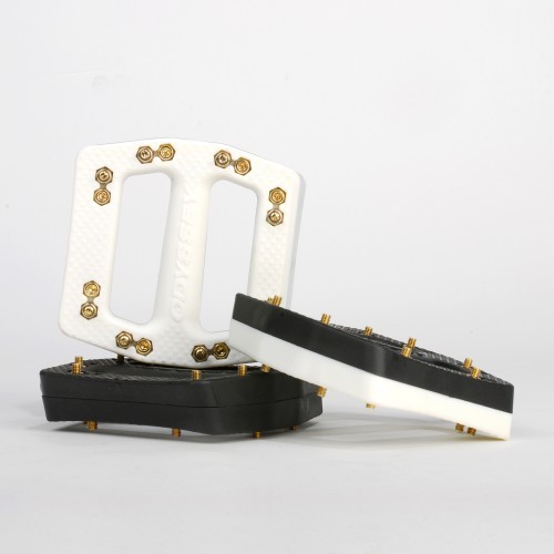 Odyssey aduce pedalele de plastic la un nou nivel. Odata cu lansarea modelului JC PC, bikerul are acum posibilitatea de a opta pentru un set de pedale realizate din plastic, insa cu tinte fabricate din metal. Acestea cantaresc foarte putin si ofera o aderenta excelenta.