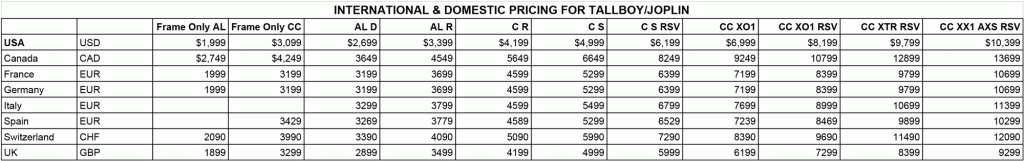 Noul Tallboy 4 e disponibil în două culori, Galben Rocksteady și Purpuriu Stormbringer și are două tipuri de cadru din carbon, modelul de top CC și modelul mai ieftin C. Echipările de top includ componente Shimano XTR sau SRAM Eagle AXS în timp ce la baza gamei din carbon se află transmisia SRAM NX Eagle.