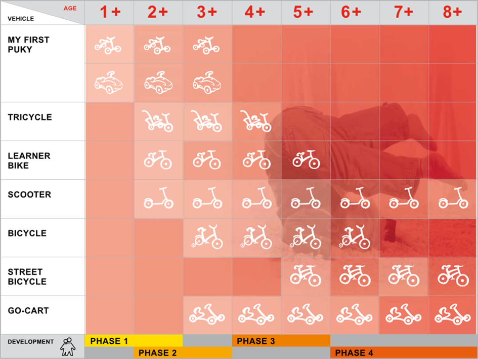 O scurtă introducere a fost binevenită dar și suficientă, pentru că a sosit timpul să trecem la vehiculele propriu-zise. Cum spuneam, Puky are o paletă largă de produse, pe care le oferă în funcție de fazele de dezvoltare ale copilului, în număr de patru: