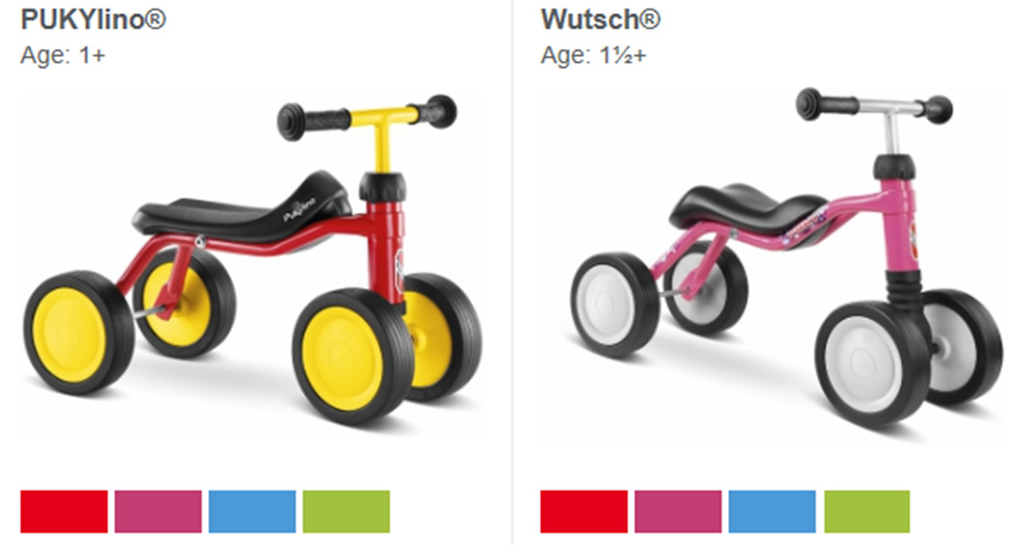 Primul lui Puky poate să fie ori Wutsch ori PUKYlino. Ambele vehicule sunt un excelent punct de start în dezvoltarea mobilității copilului, iar principala diferență este dată de mediul de utilizare. PUKYlino este gândit pentru utilizarea în spații închise, iar Wutsch pentru afară. Pentru ambele vehicule, copilul trebuie să aibă minim 75-80 cm înălțime și să poate să stea în picioare și să meargă (neajutat). În schimb, Puky îl va antrena în mișcări de direcție și împingere.