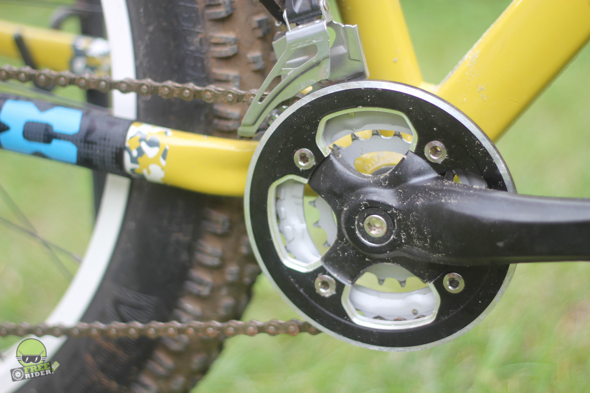 Mi-a plăcut însă în mod special angrenajul cu două foi, care dispune de o protecție metalică, gen „bash guard” cum mai găsești la bicicletele de dirt jump. Nu prea își are locul pe bicicleta asta, dar din nou, merge și așa.