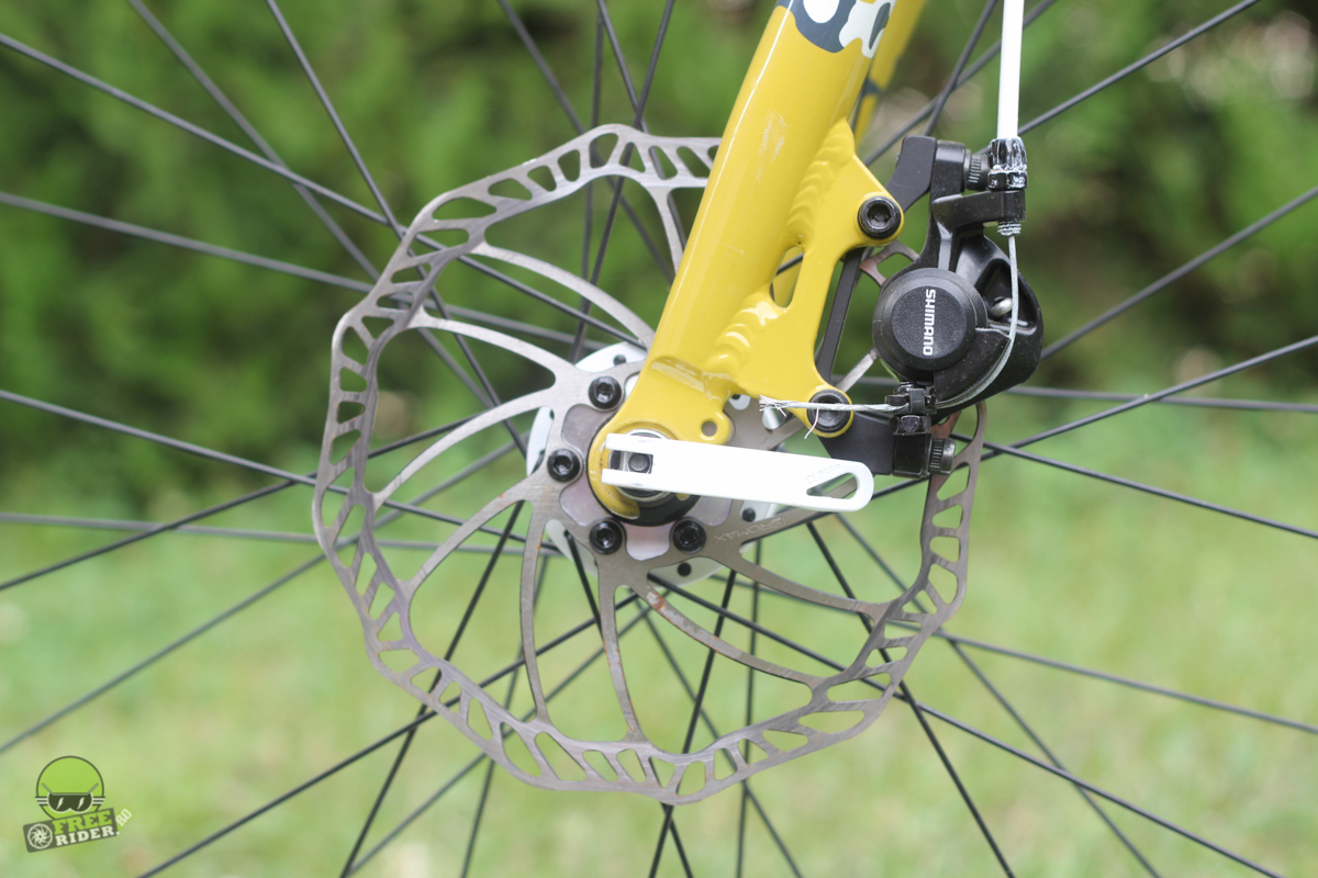 Frânele mecanice pe disc Shimano Tourney țin, însă nu impresionează. În opinia mea discurile mecanice reprezintă cel mai nefericit compromis pentru că nu au nici forța nici modulația hidraulicelor. În teren frânele pulsau destul de mult atunci când le acționam, dar la final își făceau datoria și te opreau.