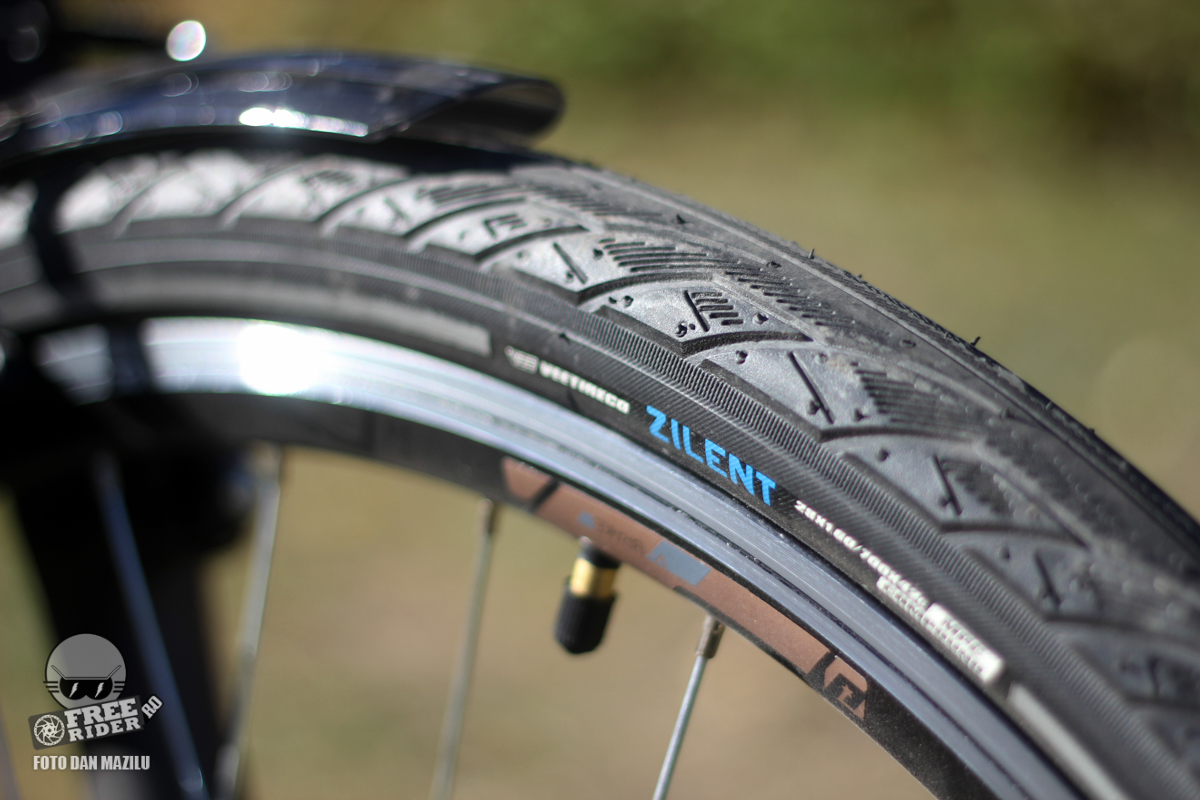 Tot legat de vizibilitate, la cele două modele City Hawk nu mai nevoie să pui catadioptrii pe spițe întrucât roțile au din start o dungă reflectorizantă pe ambele părți. Anvelopele VeeTire Zilent de 700x42c (sau 28×1.6) le consider potrivite pentru această perioadă, umedă și rece. Vor fi la fel de bune și la vară. Sunt rapide, nu te solicită și da, sunt silențioase, așa cum sugerează și numele. Însă va trebui să te gândești la altă variantă pentru când va începe înghețul. Chiar dacă drumurile sunt deszăpezite, există șansa să apară și polei, moment în care Zilent-urile nu mai fac față. Nu e nevoie de anvelope cu țepi ci doar de ceva cu profil similar anvelopelor auto de iarnă.