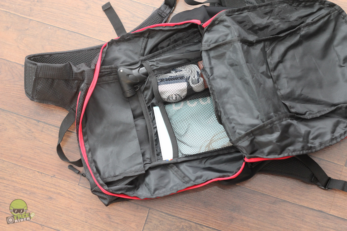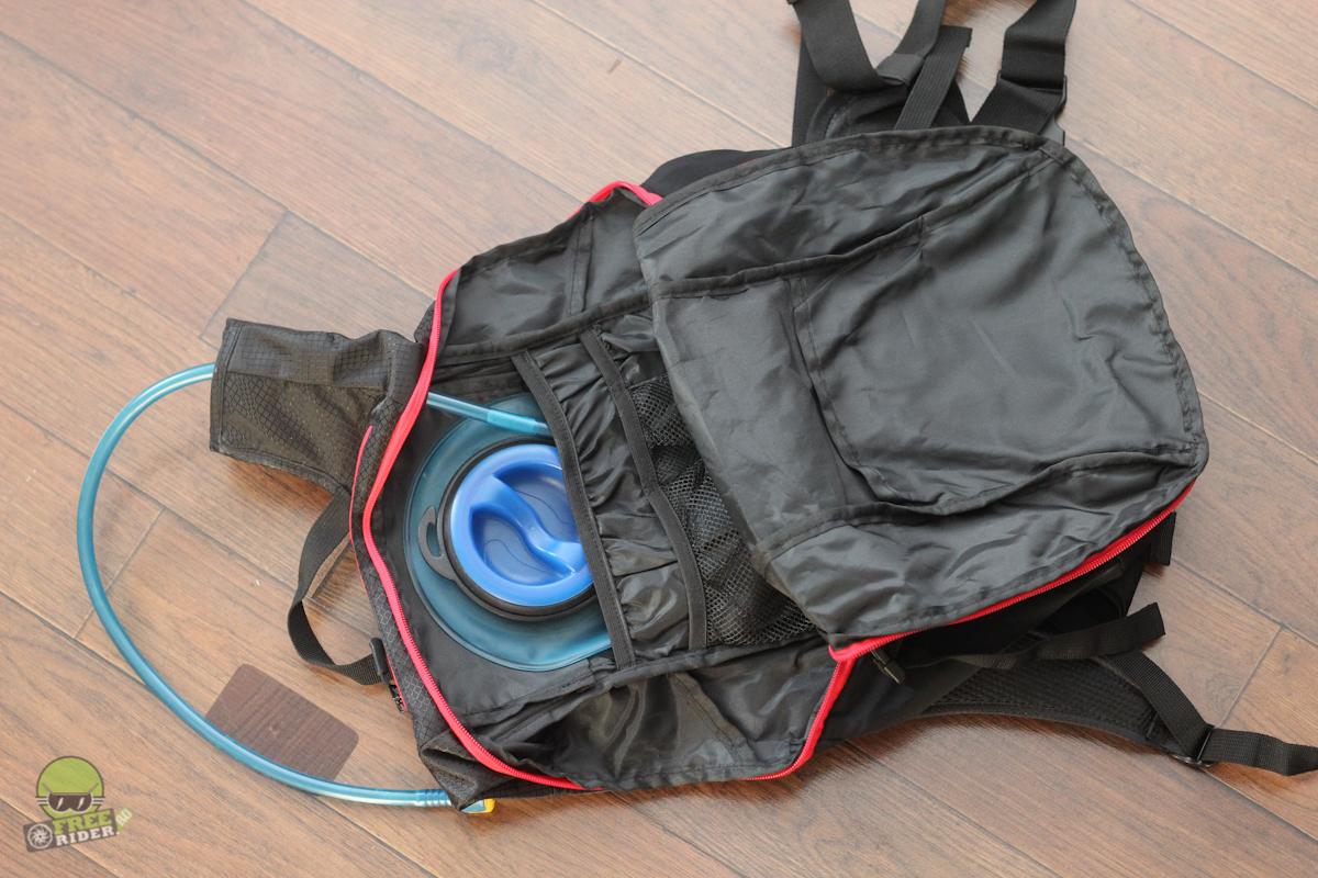 Buzunarul mare din interior este special făcut să poţi pune acolo burduful cu apă. Furtunul poate fi scos apoi spre exterior prin două orificii, fie pe stânga fie pe dreapta. Dacă însă poţi transporta apa pe bicicletă, în bidon, atunci acel buzunar poate fi folosit la altceva. Ţine cont de faptul că dacă vei folosi acel buzunar pentru apă, atunci în rucsac vor încăpea mai puţine lucruri.