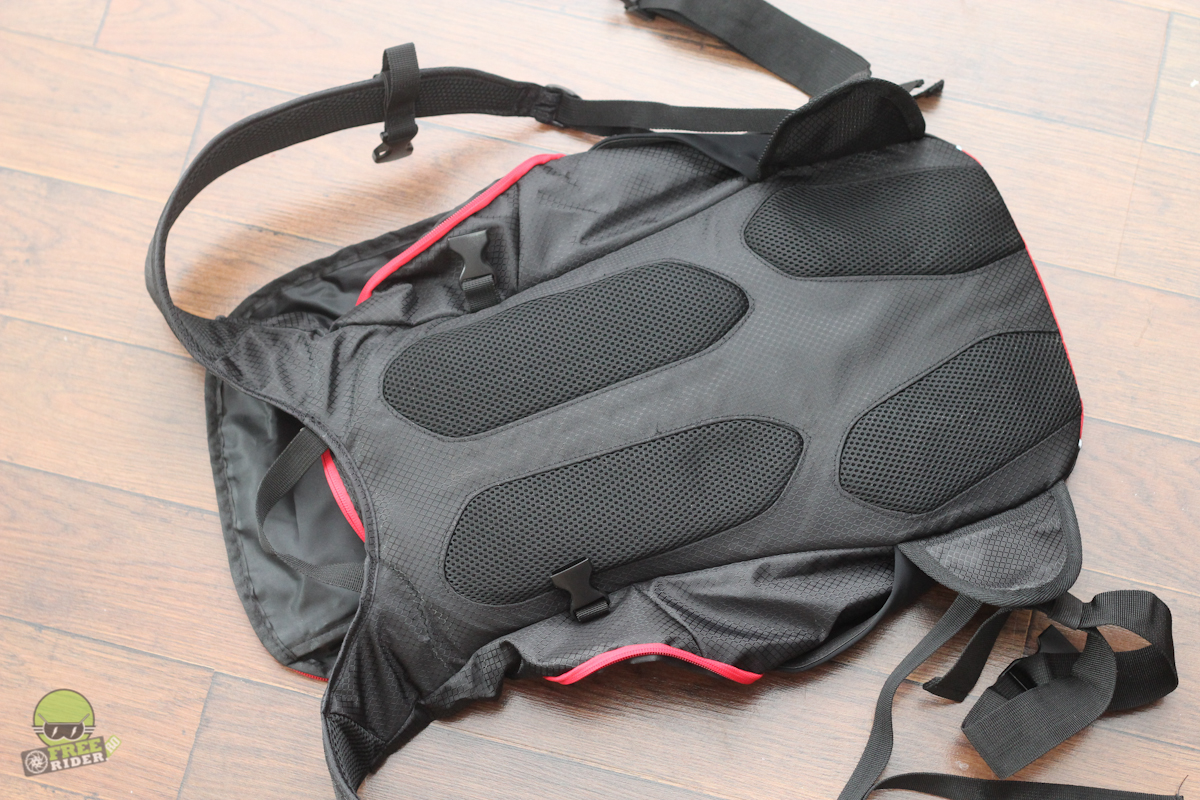 Pe spate întâlnim mai multe specificaţii care sunt utile la bicicletă. În primul rând este gaica unde poţi agăţa un stop, apoi avem două chingi de care poţi prinde casca atunci când nu vrei să o foloseşti, spre exemplu când ai de urcat timp îndelungat şi ştii că nu urmează nicio coborâre pe care să fie nevoie de cască. După care mai avem două „clipsuri” din plastic de care poţi agăţa ochelarii de protecţie tip goggles.