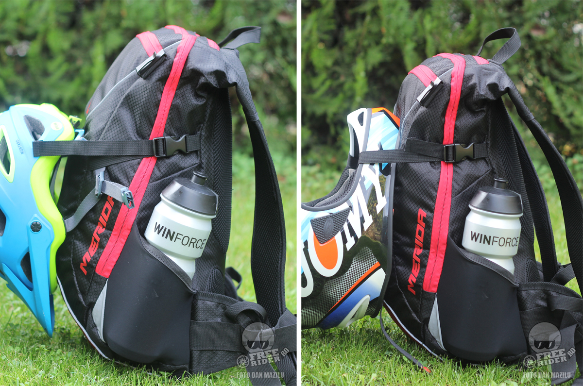 Pe laterale regăsim două buzunare din plasă pentru care eu am găsit mai multe întrebuinţări. Le poţi folosi fie pentru a mai transporta recipiente cu apă, fie să ai telefonul la îndemână pentru poze, fie le foloseşti pe post de coş de gunoi atunci când mănânci un baton de ciocolată şi arunci ambalajul.