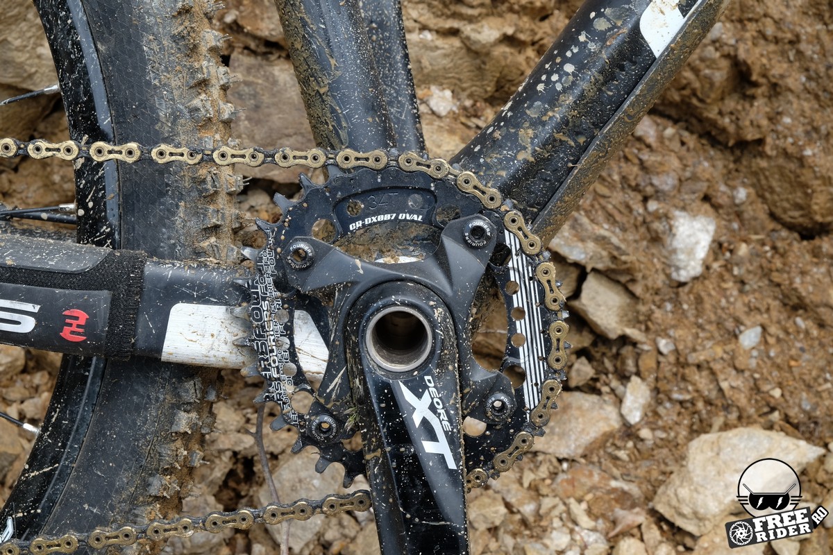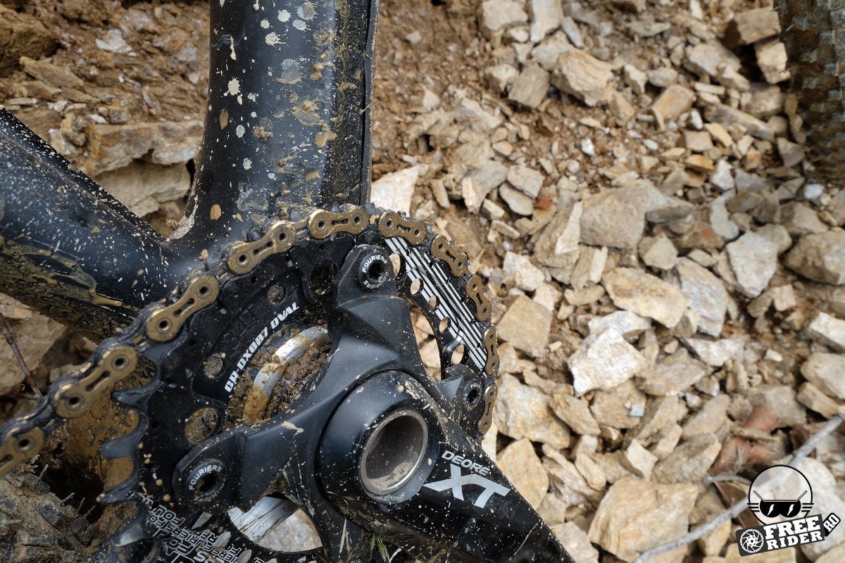 Lanțul stă foarte bine pe foaie, căci cei de la Fouriers au dotat-o cu dinți foarte înalți. De asemenea, este ușoară, cântărind doar 79 de grame în versiunea pe care o vezi aici. Multe găuri ajută la menținerea unei greutăți cât mai scăzute. Totodată, cei de la Fouriers au dotat foaia în prezent cu 3 găuri distincte de montaj, astfel încât să obții punctul maxim al foii ovale acolo unde dorești. Eu am instalat-o pe gaura din mijloc și mă declar mulțumit. În ceea ce privește performanța, nu pot spune că am sesizat o diferență uriașă, însă este adevărat, ajungi mai ușor în punctul maxim, ca apoi să poți pedala în forță. Pe jos, asta se traduce printr-o urmă mai proeminentă lăsată de anvelopă pe pământ, chiar dacă tu nu sesizezi efortul. Sau altfel spus, urmele pe care le lași te-ar putea da de gol că rulezi cu foi ovale. Cu cei 34 de dinți, m-am descurcat să urc și cele mai abrupte pante, însă trebuie să menționez aici și progresul pe care l-am obținut în urma antrenamentelor intense din ultima perioadă. Încă sunt de părere că începătorii ar trebui să opteze pentru o foaie cu 30 de dinți, dacă se decid să facă trecerea la 1x și abordează și trasee cu urcări dificile. În ceea ce privește coborârile, lanțul a rămas în permanență pe foaie, nefiind nevoie de niciun chainguide suplimentar, dar sincer, nici nu mă așteptam să existe astfel de probleme.