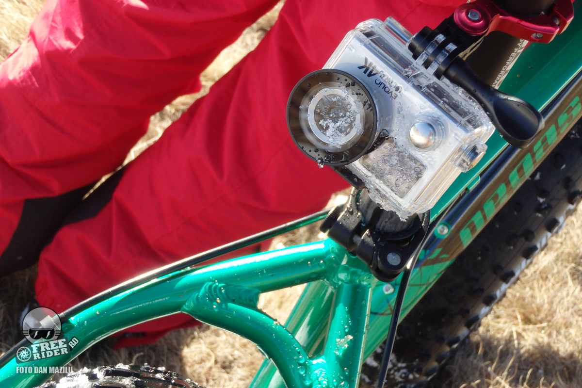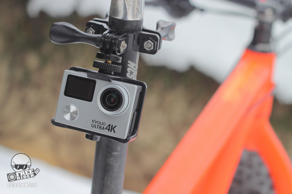 Carcasa de protecție antișoc și subacvatică este identică din punct de vedere al dimensiunilor cu modelul anterior Evolio 4K. Acesta la rândul ei era compatibilă cu GoPro Hero 4 mulțumită amplasării identice a butoanelor. Pe traseu noi am preferat să folosim un suport din aluminiu pentru a fixa carcasa de ghidonul bicicletei, pentru a elimina eventuale vibrații datorate suportului original din plastic. Totuși le-am folosit și pe acestea, iar rezultatele nu au fost deloc slabe.