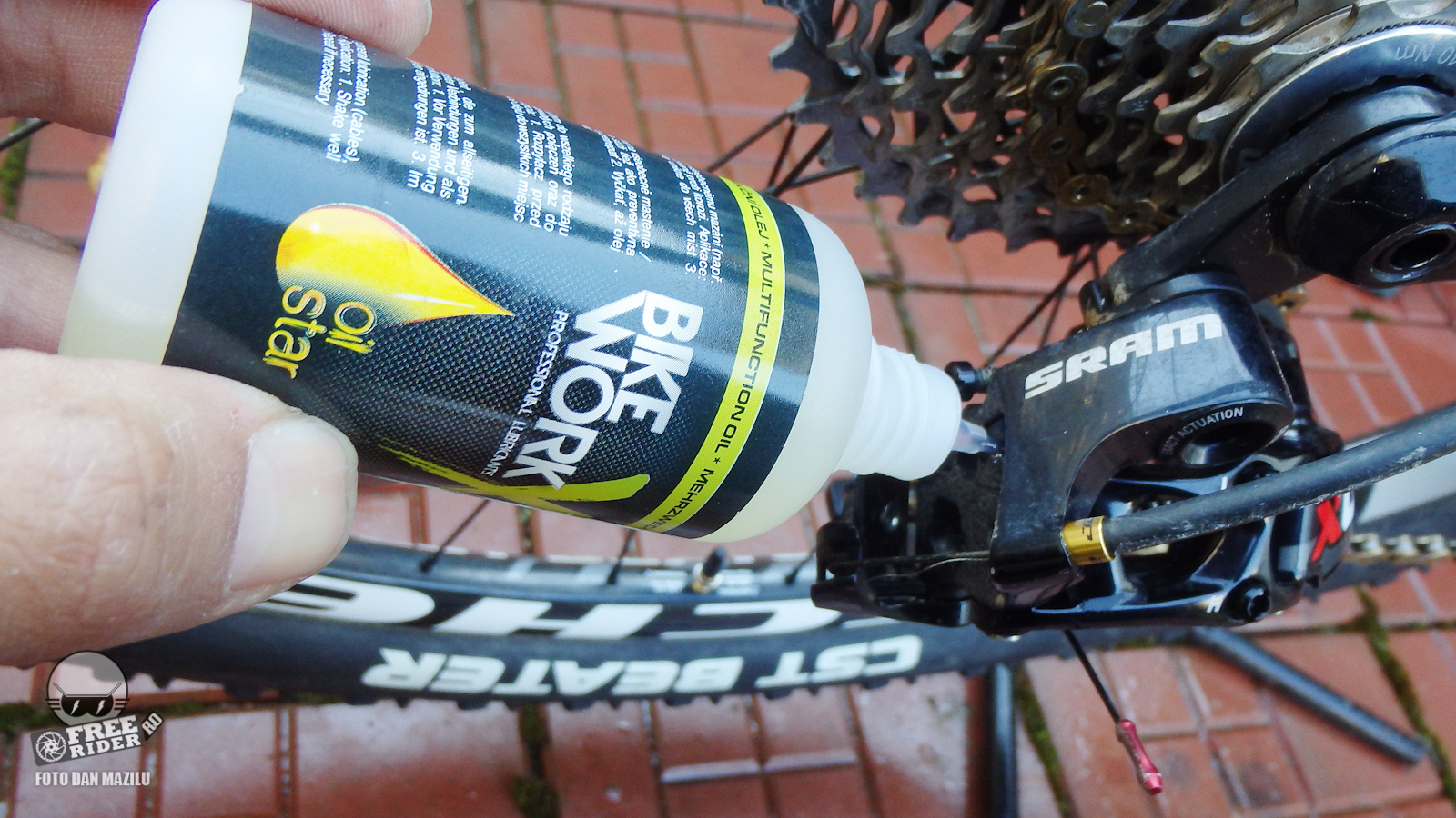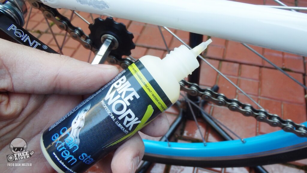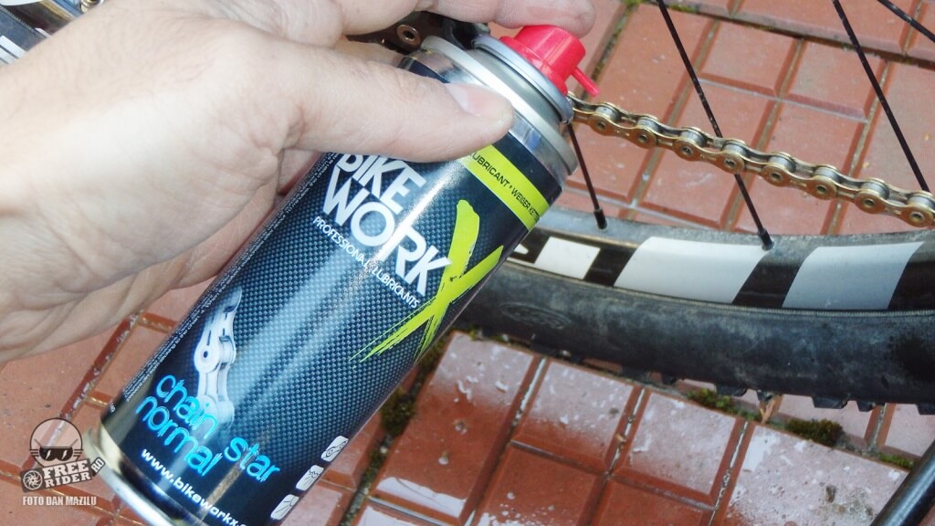 Unul dintre cele mai cerute pe piaţă, în special pe timp de iarnă, este un ulei bun pentru lanţ. BikeWorkx oferă trei variante – Chain Star Extrem, Wax şi Normal, fiecare disponibil în recipient mic, portabil, de 50ml la preţul de 21 lei sau spray de 200 ml la preţul de 43 lei. Chain Star Extrem este un ulei gros ce se lipeşte de lanţ şi care nu se spală prea uşor. La spălat mă refer la ploaie, lapoviţă sau ninsoare. Astfel protecţia rezistă mai mult timp. Am fost plăcut surprins şi de faptul că la un moment dat, când curăţam o bicicletă pregătind-o pentru o sesiune foto, a fost suficient să şterg lanţul cu o cârpă, acesta fiind tratat în prealabil cu uleiul Extrem. Cu alte cuvinte nu s-a îmbâcsit cu mizerie şi nu a fost nevoie de degresanţi speciali pentru a-l face strălucitor.