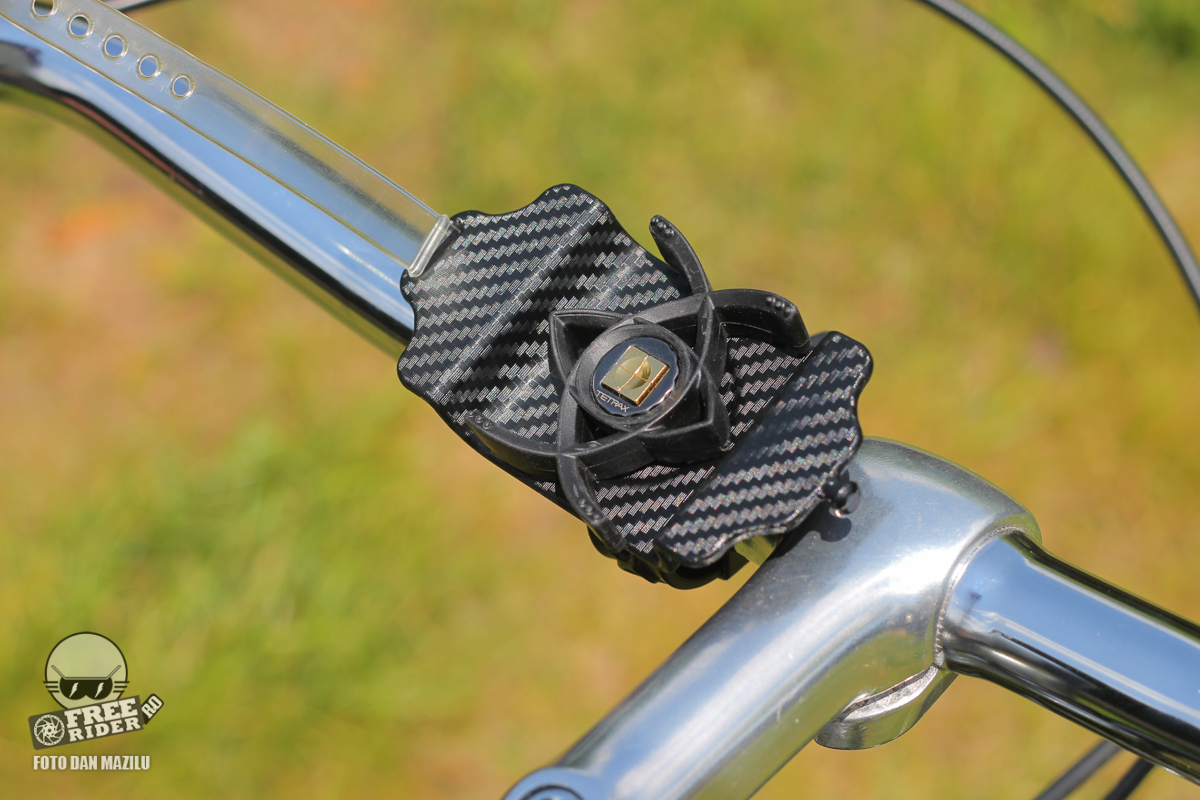 Tetrax este o companie italiană mai puțin cunoscută în România, care produce suporturi de telefon pentru mașină. Însă unul din ultimele lor produse este un astfel de suport destinat bicicliștilor. Produsul ne-a plăcut din start întrucât partea care rămâne fixată de telefon este extrem de minimalistă. Este un simplu și mic buton magnetic.