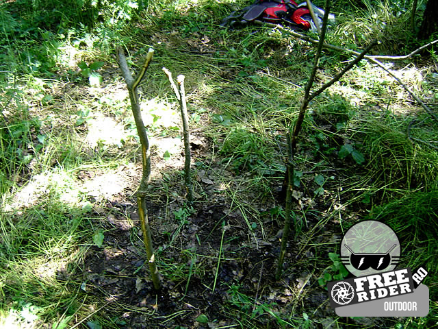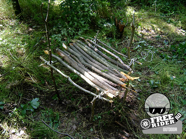 În primul rând caută 4 beţe care să fie bifurcate în capăt. Două scurte, de aproximativ 50-60 cm lungime, și două mai lungi de 1-1,20 m. Cele lungi de preferabil ar fi să aibă încă o bifurcaţie la nivelul celor două beţe mai scurte. Dacă nu găseşti nu pierde vremea, le vei lega. Mai ai nevoie de 4 beţe egale de aprox. 60-70 cm, 1 băţ de 80-90 cm care să fie ceva mai grosuţ şi de preferabil verde, 10-12 bucăti de lemn mai gros cu o lungime de 70-80 cm (în general trebuie să fie cu 10 cm mai lungi decât cele 4 beţe de 60-70 cm).