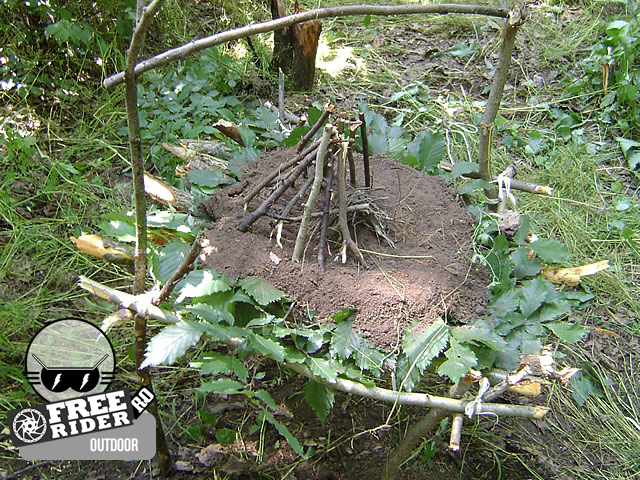 De reţinut: Durata de timp în care poţi construi o asemenea vatră, ţine de cât de repede găseşti materiale de calitate. Când spun “calitate” mă refer la rezistenţă. Există şansa ca neavând beţe de susţinere suficient de puternice sau suficient de fixate, întreg ansamblul să se prabuşească. În mod normal durează 30-40 min să construieşti un asemenea suport.